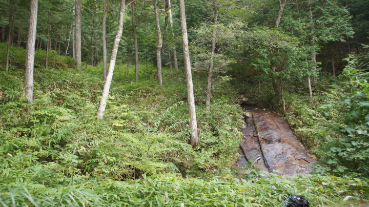 軽く登ろうと思って登山口まで行きましたが数年来全く人がはいった形跡が無く、水の流れ道のようになっていたのでバイクで入っていきました(よい子は真似をしないように) 沢みたいな所を登って行きましたが途中で倒木があり記念写真を撮った画像です。 これはバイクを離れ手持ちで写したモノです。 画像ではそれほどでもないですが傾斜はきついです。 |