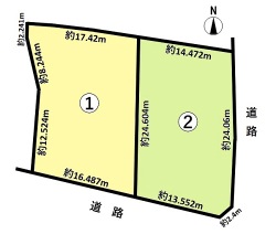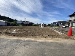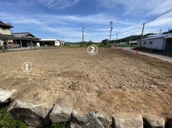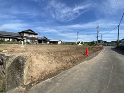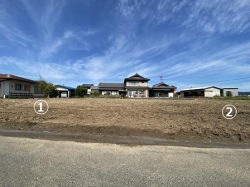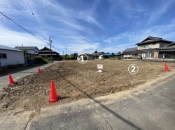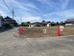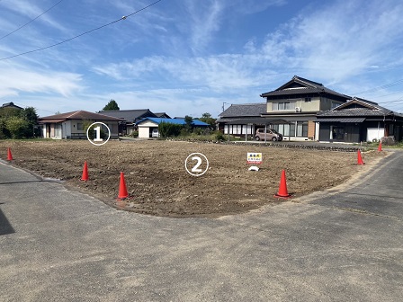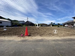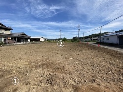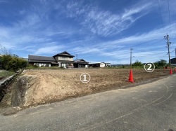 | 備 考 | ● 造成工事(北側、西側、間仕切りブロック積み)完了後、引渡しとなります(令和7年12月末頃予定) ※ 西側と北側には水路が有り、おおよそ、その中心が隣地との境界線となります。 ※ 道路側溝が無いため、雨水は宅地内において、地下浸透式にて処理してください。 (オーバーフローした分のみ、水路に放流してください) ※ 南側の電線が空中越境しておりますことを、予めご承知おきください。 ※1号地、上下水道引込工事要 ※2号地、上下水道引込済 ※セットバック要 ※建築条件なし図面と現況が相違する場合現況を優先します |
