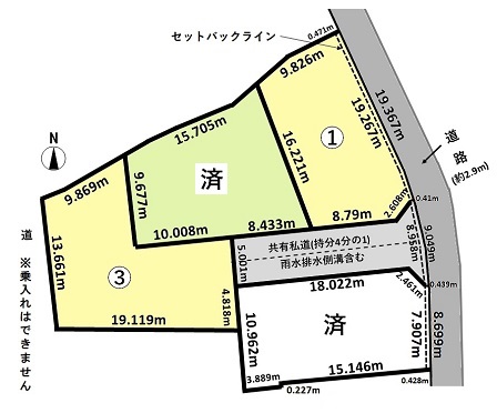 | ・共有私道(雨水排水溝・公共マス含む)は4区画所有者全者の使用とし、維持管理負担も同様とします※持分は4分の1 ・1号地の建築確認許可における接道条件は東側公道とし、共有私道を建築面積に含めないものとします。 ・2号地、3号地の建築確認許可における接道条件は東側公道とし、共有私道の2分の1を建築面積として算入できるものとします |